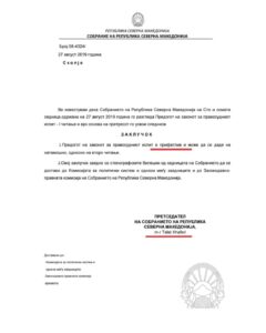 Më 27 gusht 2019 Talat Xhaferi ka nënshkruar dokumentin ku Ligjin për provimin e jurisprudencës e shpall si të pranueshëm, edhe pse aty nuk ka qenë e përfshirë e drejta që provimi të jepet edhe në gjuhën shqipe.